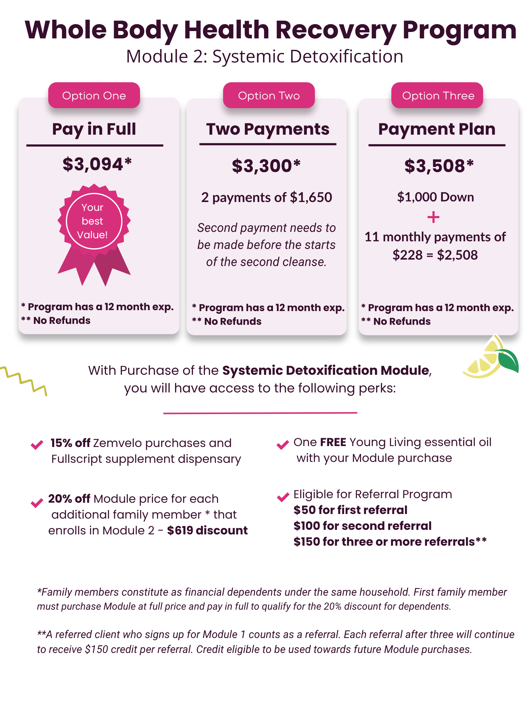 There is an order, timing and very specific approach to detoxifying a human body efficiently, effectively and properly. A systemic, whole body cleanse is the first step in the detoxification process. During this program, you will complete two Master Cleanse protocols over 6 to 12 months with support & follow up to track your progress.