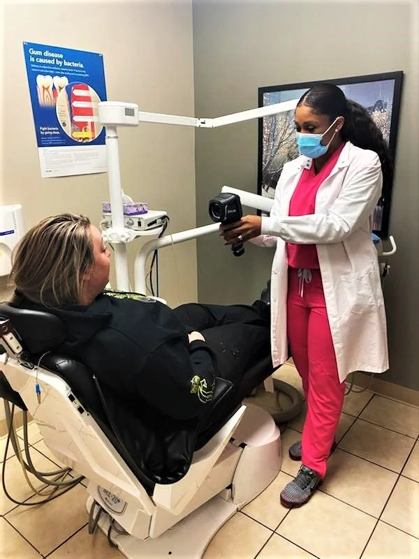 Photo pictured shows RDH Sasha Bryant demonstrating the use of DMT Scan imaging inside dental offices.